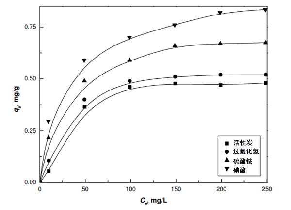 用活性炭和改性活性炭進行平衡吸附實驗,以評估它們使用合成的鎳廢水從水性介質中除去二價鎳的能力。通過用0.1g活性炭與50mL濃度范圍為10mg/L至250mg/L的Ni(II)溶液平衡進行實驗,結果顯示在圖2中;钚蕴康拿靠宋饺萘恐蛋匆韵马樞蛟黾樱夯钚蕴>過氧化氫>硫酸銨>濃硝酸。氧化活性炭的容量增加是由于存在大量酸性基團,其可以與水溶液中存在的陽離子鎳交換它們的質子。