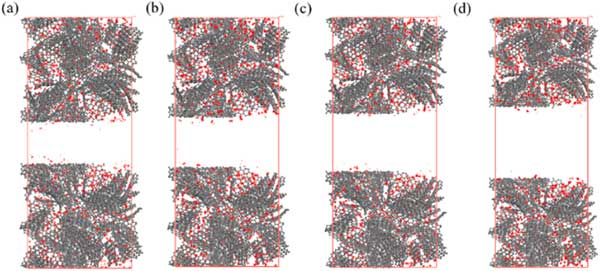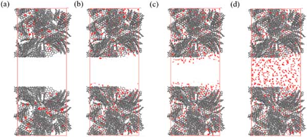 活性炭由微孔和介孔組成,介孔在一定程度上影響吸附特性。因此,研究芳烴在具有分級孔的活性炭上的吸附特性,以明確介孔對下一節吸附特性的影響。在這些模擬中,選擇了密度為0.8g/cm3的微孔活性炭,不同樣品的中孔尺寸分別選擇為2.0、2.5、3.0和4.0nm。具有不同層次孔隙的活性炭。分層孔隙活性炭模型構建為密度在0.6-0.7g/cm3的合理范圍內。圖3展示了苯分子在p=10kPa下具有不同中尺度孔徑的活性炭上的吸附位點分布。這表明即使在p=10kPa時,苯的吸附也僅發生在介孔表面,而不會填充介孔的空隙空間。圖4說明了對二甲苯在具有3.0nm孔的活性炭上從低壓到高壓的吸附位點的變化。從圖4(a)-(d)可以看出,只有微量的對二甲苯分子被吸附到微孔上,當壓力為1.25kPa時,微孔逐漸被填滿,中孔壁上出現吸附位點。當壓力增加到3.75kPa時,吸附位點增加,介孔中開始出現多層吸附,最終介孔充滿對二甲苯,此時壓力可達6.25kPa。