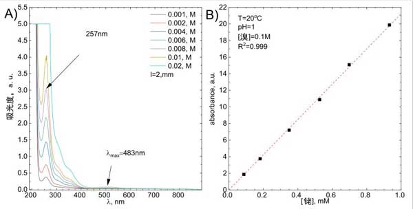 圖1:(A)研究溶液的UV-Vis光譜作為銠初始濃度的函數,(B)使用圖形方法測定摩爾吸收系數。