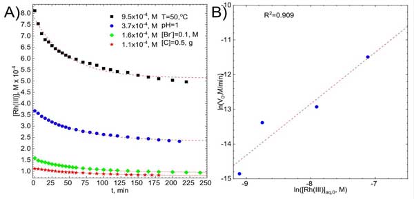 很明顯,銠溴化物絡離子的初始濃度將影響它們在電解質中的平衡濃度和吸附過程的速率。這是圖2A,其中繪制了在T=50℃下在攪拌溶液中獲得的動力學曲線,攪拌速率為1200rpm。得到離子之間的線性相關性,確定系數接近圖2B。擬合線的斜率等于1.48±0.33,證實了初始假設,即關于銠溴化物絡離子初始濃度的反應的第一級。吸附動力學還應取決于活性炭的表面積,前提是系統不受擴散控制。這已針對不同濃度的吸附劑進行了驗證。