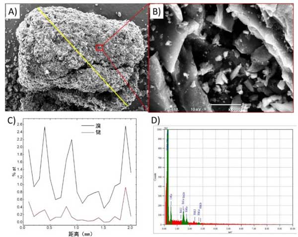 圖3:吸附試驗后活性炭樣品的SEM圖像(A)表示進行EDS分析的線的總體視圖,(B)進行EDS點分析的區域的放大率,(C)EDS線分析結果,(D)選定點的EDS光譜。