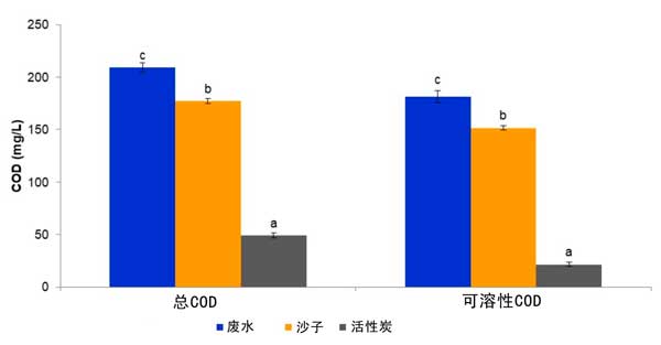 圖2:通過砂濾器和活性炭吸附柱系統處理經過生物處理的含殺菌劑的流出物時的總COD濃度和可溶性COD濃度。對于每個測量參數,由相同字母指定的條形在5%的水平上沒有顯著差異。