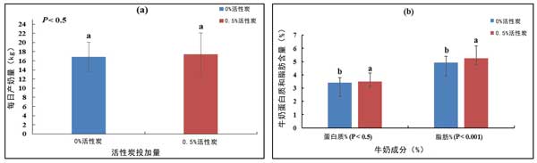 圖2:(a)活性炭對(duì)每日產(chǎn)奶量(kg)的影響,(b)乳蛋白和脂肪(%)。