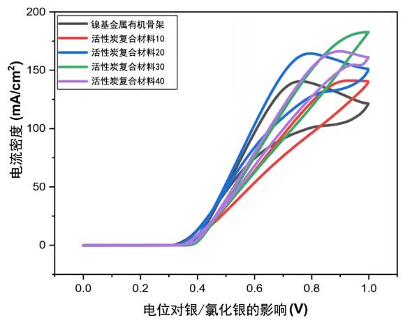 通過在KOH和CH3OH中氧化甲醇,使用循環(huán)伏安法測試活性炭復合材料的電化學性能。具有活性炭復合材料的鎳金屬對甲醇氧化反應表現(xiàn)出更高的催化活性(見圖2)。在鎳金屬改性玻璃碳電極的情況下,峰值電流密度沒有添加活性炭的高。具有更高濃度活性炭(40mg)的樣品顯示出高峰值電流密度。隨著活性炭量(60mg)的進一步增加,峰值電流密度降會稍微降低。綜上所述,建議將活性炭的濃度增加到一定限度可以提高電流密度。然而,增加活性炭的濃度也可能對催化活性產(chǎn)生不良后果。此外,活性炭復合材料的CV曲線具有不同的形狀和峰位置,這是因為合成時活性炭分散不完全,也由于其大量使用導致催化劑發(fā)生簇集,導致覆蓋金屬有機框架表面,從而阻礙活性催化位點在低電位下進行反應,從而在高電位下發(fā)生電荷轉移。