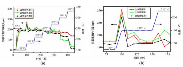 圖1:(a)催化試驗期間下游鄰氯苯酚濃度的演變。(b)圖(a)150至210℃的局部放大率。