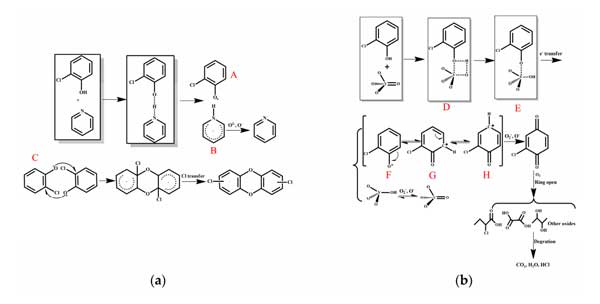 圖2:鄰氯苯酚氧化的反應機制,包括(a)氨改性活性炭和(b)其他改性活性炭。