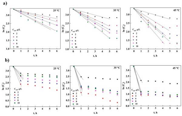 圖2:不同溫度下的外部傳質分析(a)活性炭和(b)粉末活性炭。