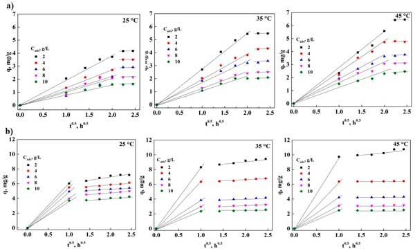外部和粒子內傳質過程的分析可以對3,5-二硝基水楊酸的吸附產生顯著影響,在去除3,5-二硝基水楊酸時可能存在由于物質傳輸造成的限制,這有必要對這種現象進行分析。圖2a是以外擴散模型為基礎構建的,從中可以看出,對于活性炭,在吸附過程中接觸長達6小時的實驗點處存在一條直線,這表明存在以下可能性,在任何溫度的過程中通過外部傳質控制。圖2b顯示了粉末活性炭在3,5-二硝基水楊酸吸附中獲得的實驗數據的表示,其中在與吸附劑接觸1小時時觀察到一條直線。這表明使用活性炭粒子不存在外部傳質問題,因為3,5-二硝基水楊酸會迅速從溶液中去除,擴散到表面。此外,這表明活性炭顆粒中的吸附過程可能是由于表面存在的官能團。根據這些結果,確定是否也存在內部傳質問題很重要,從而能夠確定3,5-二硝基水楊酸刪除過程是否受到這種現象的存在的顯著影響。