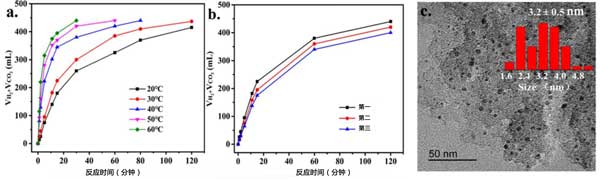 圖3:(a)在不同反應溫度下由活性炭載鈀催化的總體積(H2+CO2)生成和(b)甲酸分解的穩定性測試。(c)回收的活性炭催化劑TEM顯微照片和粒度分布。