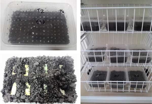 含活性炭和不含活性炭的纖維紙被切成3厘米x1厘米的條。這些紙在75℃下干燥48小時,干燥后的重量計算為初始干重。將紙張放入裝有堆肥土壤的塑料容器中,該土壤由農業產業生產的堆肥生活垃圾制成,濕度為45%,并用多孔蓋子蓋住。試驗組由12次重復組成,觀察12周,間隔4周(3次采樣)。采樣時間表示為T1、T2和T3。初始條件表示為T0。在取樣時,取出紙片并用軟刷清潔。土壤中生物降解試驗的描述如圖1所示。