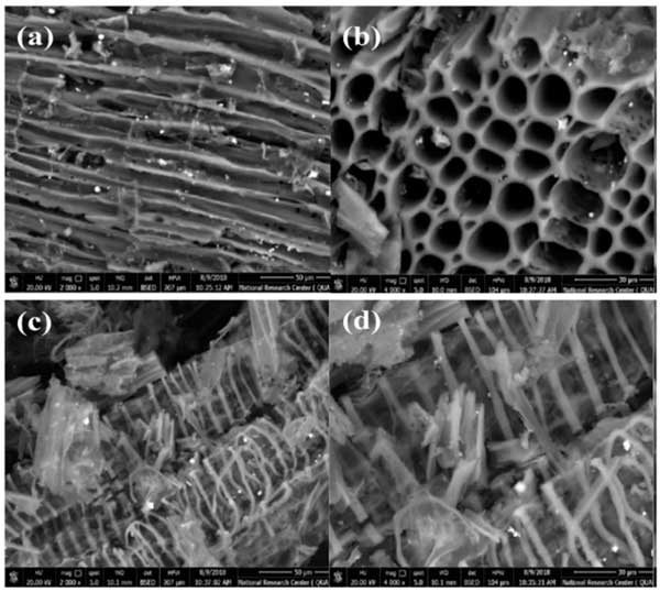 圖1:不同放大倍數(a和c-2000倍,b和d-4000倍)下活性炭(a,b)和改性活性炭(c,d)的掃描電子顯微鏡(SEM)。