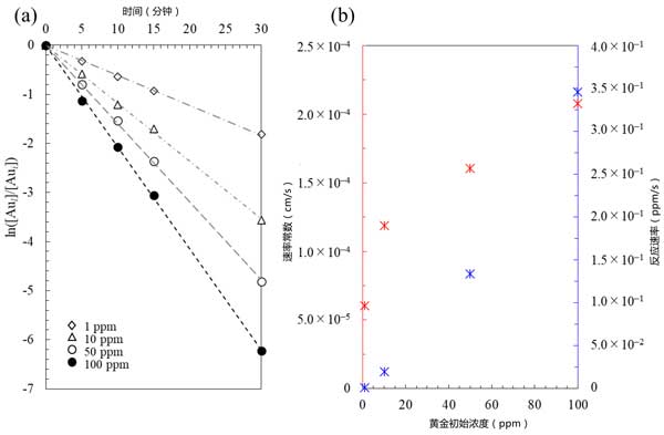 圖1:(a)初始金濃度對金離子回收率的影響,和(b)通過鋁和活性炭在銨中的電流相互作用進行的膠合反應的速率常數/反應速率與初始金濃度的關系圖硫代硫酸鹽體系(注意反應速率為負值)。