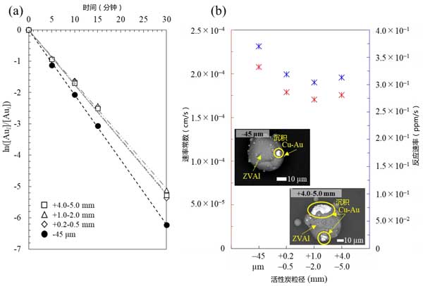 圖2:(a)活性炭尺寸對金離子回收率的影響,以及(b)鋁和活性炭在硫代硫酸銨體系中通過電偶相互作用進行的膠合反應的速率常數/速率與活性炭尺寸的關系圖(注意,反應速率為負值)。