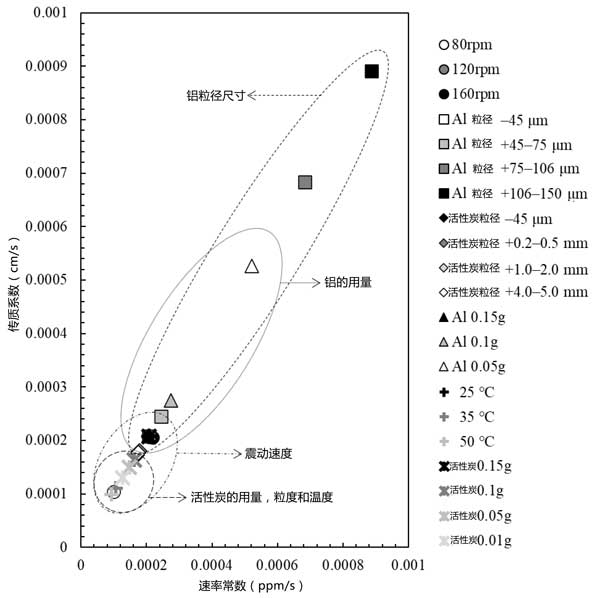 圖3:基于本研究中所有黃金回收結果的速率常數和傳質系數圖。