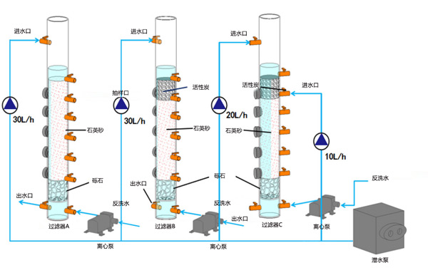 試驗裝置如圖1所示,主體結構采用有機玻璃制成,內徑70mm,高度2000mm。過濾器包括進水管、出水管、反沖洗水管、支撐層和過濾介質層。200毫米高的支撐層由礫石制成。粒徑為0.5-1mm,和分別為1-2mm,過濾層的填料為石英砂和椰殼活性炭。過濾器A的填料層為1000mm石英砂。過濾器B、C的填料層均為上層200mm椰殼活性炭和下層800mm石英砂。根據水廠的設計規范,過濾器的過濾速度為8m/h,進水流量為30L/h。過濾器A和B為單點進水,過濾器C為兩點進水,兩個進水點分別位于過濾器頂部和20cm深度處;第一進水點流量為20L/h,第二進水點流量為10L/h。過濾器A和B是過濾器C的空白對照。過濾器每24小時反洗一次。