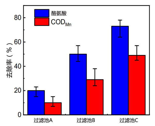 活性炭濾池出水二氯乙腈前體酪氨酸和CODMn的平均去除率如圖2所示。實驗過程中,三個活性炭過濾器出水酪氨酸濃度依次下降:過濾器C(73%)>過濾器B(50%)>過濾器A(20%)(p<0.05)。生物濾池出水的酪氨酸濃度低于進水。誰記錄了飲用水處理廠生物過濾后出水中DON濃度的增加,表明DON總體出水濃度的變化并不代表個體的變化,而是過濾器中不同個體的變化規律也不同。平均出水CODMn去除率的變化趨勢與平均出水酪氨酸去除率一致。CODMn去除率可以反映生物濾池中有機物的去除情況。酪氨酸是一種有機物,其分子結構中含有還原性酚羥基和氨基,可被高錳酸鉀氧化。因此,CODMn去除率也可以作為酪氨酸去除的依據。
