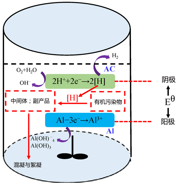 根據(jù)實(shí)際工況,提出了一種可行的活性炭載鋁微電解工藝分解水生環(huán)境中有機(jī)污染物的反應(yīng)機(jī)理(圖2)。由于其高吸附容量和電導(dǎo)率,活性炭被用作陰極保護(hù)。在陽極(鋁廢料),由鋁提供的電子通過微型原電池轉(zhuǎn)移到陰極(活性炭),吸附在陰極表面的有機(jī)污染物受到這些釋放的電子的攻擊。水電離產(chǎn)生的H+在陰極獲得電子并產(chǎn)生具有強(qiáng)化學(xué)反應(yīng)性的活性氫[H]或H2,和活性氫[H]·可以部分降解有機(jī)污染物。此外,Al失去三個電子形成鋁離子(Al3+)。然后,鋁離子沉淀形成氫氧化鋁(Al(OH)3、Al(OH)-4等)。作為有利的絮凝劑,這些氫氧化鋁可以有效去除廢水中的有機(jī)污染物。難降解污染物在活性炭載鋁微電解工藝的輔助下被分解為小分子中間體,也可以通過氫氧化鋁絮狀污泥的絮凝共沉淀來消除。換言之,與活性炭載鋁微電解工藝相關(guān)的許多協(xié)同效應(yīng)可以有效地分解水環(huán)境中的有機(jī)污染物。