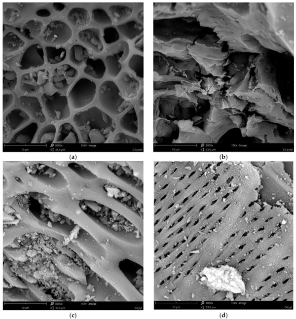 在溶劑加載之前的活性炭通過使用掃描電子顯微鏡作為SEM顯微照片進行表征(圖1)。分析表明,不僅研究不同材質活性炭彼此的不同,而且在一種材料中也可能出現不同的結構(圖1a與圖1b、圖1c與圖1d、圖1e與圖1f和圖1g與圖1h)。所有的材料都不是均質的,在所有的原材料中,都可以發現具有不同孔隙率的顆粒、壓實的塊狀,甚至是纖維結構。材料C1(粒徑0.5÷0.75mm的活性炭)是高度多孔的,顆粒充滿可見孔,直徑為5÷11µm,壁光滑(圖1a),顆粒結構的壁密度較低,但也有很大的表面積(圖1b)。粉狀活性炭(C2)具有較小的(圖1d)和較大的(圖1c)孔,具有光滑(圖1c)和較粗糙(圖1d)的壁和細長的形狀。這兩種材料似乎都具有良好的孔隙率和表面,因此它們應該是非常有效的吸附劑。我們的結果證實,C1和C2在鉭的去除方面都非常有效,去除效率約為97%。C3的多孔性要小得多。雖然有一些顆粒具有相對較高的孔隙(圖1e),但也有較高含量的更致密、相當無孔的塊狀(圖1f)?紫督Y構受到輕微干擾,可能是由植物材料中可能存在的無機化合物晶體造成的(圖1e)。因此,這種結構表明較低的表面和吸附特性。然而,無孔件的表面積似乎很發達(圖1f)。這是相當虛幻的,因為在使用的所有活性炭中,材料C3的鉭去除效率最低(81%)。最小的大孔材料似乎是C4炭。它由具有緊湊結構的塊(圖1g)和類似于納米管或纖維結構的形式(圖1h)組成。這種材料的多孔性也比C1和C2少,但由于纖維的原因,它的表面應該比C3更發達,因此它應該具有更好的吸附效率。事實上,這種材料的鉭去除效率略高于C3,但仍低于活性炭C1和C2。根據這些結果,可以得出結論,C1和C2的原材料就具有大孔結構。