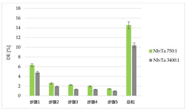 在進一步的研究中,檢查了是否可以多次使用相同部分的浸漬活性炭從鉭中提純鈮。為此,以分批模式進行解吸研究。使用了兩種不同的剝離劑草酸銨和過氧化氫的溶液(圖3),它們與鉭離子形成穩定的絡合物。解吸過程分五個步驟進行,在使用4%草酸銨溶液而不是15%過氧化氫溶液的情況下,解吸效率明顯更高。使用第一汽提劑,可以回收保留在活性炭上約50%的鉭。大部分鉭在第一步和第二步中回收,因此在第五步停止解吸,認識到繼續該過程不會顯著提高所獲得的解吸百分比。解吸效率還受吸附過程中活性炭上保留的鉭量的影響。在批量吸附過程中保留在樹脂上的鉭量的差異是由于使用了具有不同鈮與鉭比率的溶液,同時保持溶液中Nb和Ta離子的可比總濃度。降低活性炭(Nb:Ta=3400:1)上的鉭量會導致解吸效率顯著降低,這可能是由于活性炭結合了一些鉭離子。