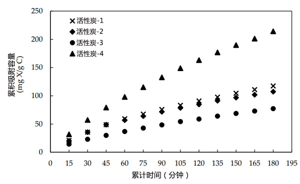 活性炭是去除有機物的常用吸附劑。吸附性能主要取決于其比表面積和微孔結構。它們具有較高的內部孔隙率,因此具有較高的吸附性。在本研究中,對四種具有不同表面性質的顆;钚蕴繕悠(活性炭-1、2、3和4)進行了去除黃藥的測試。將兩克活性炭樣品與50毫升1590毫克/升的黃藥溶液混合15分鐘。過濾活性炭,并用紫外-可見光譜法測量溶液中的殘余黃藥。通過重復使用碳樣品,重復該程序12次,以達到大吸附量。如圖1所示,活性炭-4的吸附容量比較高,因此選擇其進行進一步研究。