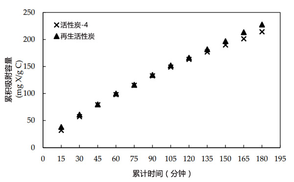 活性炭具有一定的吸附能力。隨著越來越多的成分被吸附在其表面上,吸附能力會隨著時間的推移而降低。一旦達到最大吸附容量,就不能再有效使用。對于活性炭樣品的再生,吸附的成分可以通過加熱破壞。在這部分研究中,在其表面吸附黃原酸鹽的廢活性炭樣品通過在550℃下加熱1小時進行再生。圖2比較了初始活性炭和再生活性炭樣品的吸附性能。再生活性炭和活性炭樣品的累積吸附黃藥量相差不大。結果表明,吸附在用過的活性炭上的黃藥被破壞了,它被有效地恢復并可以重復使用。
