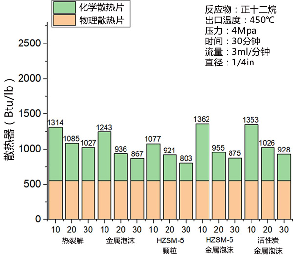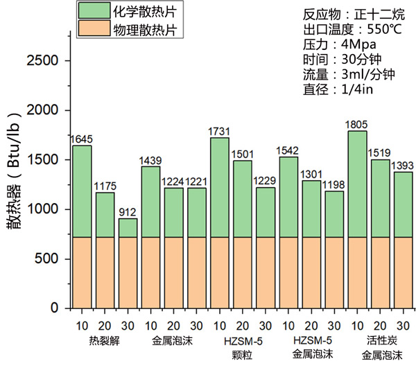 熱裂解和催化裂解產生的散熱片-十二烷在圖2顯示,溫度為450℃,壓力為4MPa。由于散熱器與使用的飛機冷卻技術直接相關,因此應慎重考慮。測量的散熱器值在10分鐘內取平均值,通過將它們除以質量流量將瓦特轉換為Btu/lb單位。反應10分鐘后,HZSM-5/金屬泡沫和活性炭/金屬泡沫樣品的散熱片分別為1342和1353Btu/lb。兩種催化劑在10分鐘內都表現出高散熱片。僅金屬泡沫和HZSM-5顆粒的初始散熱器分別為1243和1077Btu/lb。僅涉及金屬泡沫的反應的熱沉低于熱裂解的熱沉。由于反應溫度低,泡沫不作為金屬催化劑并占據反應空間30分鐘。HZSM-5顆粒在反應的前30分鐘內導致最低的熱沉,因為氣體產率低且產生大量線性石蠟。相比之下,熱裂化的散熱器保持在高值30分鐘。因此,在低反應溫度下,酸和金屬催化劑均表現出低催化效率并占據反應空間。