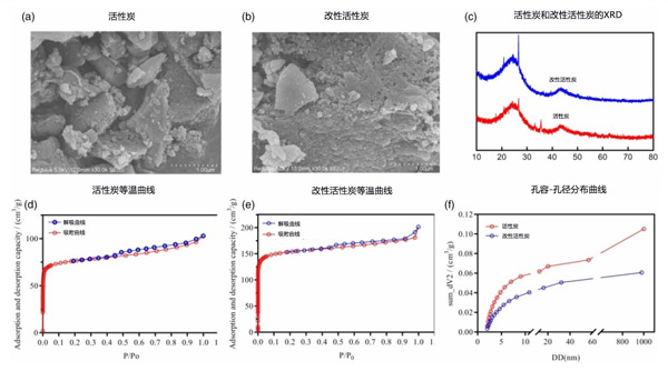當原活性炭經受0.1mol/L、0.5mol/L和0.8mol/L高錳酸鹽,煅燒溫度為400℃、500℃、800℃,煅燒時間為2小時,5小時和7小時。通過三因素三水平正交試驗和極差分析篩選出改性活性炭的合適組合。改性后觀察到活性炭表面形態發生顯著變化,分別如圖1(b)所示。改性前的活性炭表面有較大的團聚顆粒,表面沒有明顯的孔隙結構。改性后表面粗糙,呈不規則凸起的刺狀顆粒結構,孔隙結構發達。改性前后活性炭的XRD圖如圖1(c)所示。活性炭改性前后的峰形相似,但一些峰出現,另一些峰消失。圖1(d)和1(e)分別顯示了活性炭改性前后的吸附和解吸等溫線。它們整體呈隨P/P0增加的趨勢,吸附量增加,但在相同情況下,改性活性炭的吸附能力更強。圖1(f)為改性前后活性炭的孔容孔徑分布,改性后的活性炭孔體積更大。改性活性炭的比表面積是活性炭的兩倍,累積吸附總孔體積是活性炭的1.72倍。