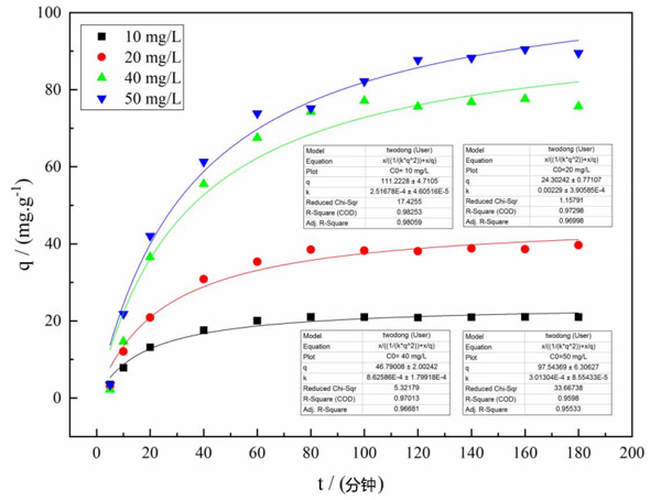 根據動力學方程,當溫度為25℃且改性活性炭用量為8g/L時,擬一級動力學和擬二級動力學分別用于擬合。發現二階動力學方程的擬合效果更好,結果如所示圖2。
