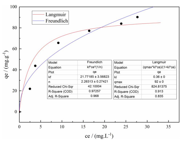 當反應溫度為25℃,投加量為8g/L時,可獲得不同初始濃度下亞硝基二乙胺的平衡濃度和改性活性炭的平衡吸附容量。使用Langmuir和Freundlich熱力學方程對數據進行擬合,結果如所示圖3從圖中可以看出,吸附過程不符合Langmuir等溫線方程,Freundlich吸附等溫線方程也適用。當初始濃度達到一定值時,吸附趨于平衡并達到飽和。