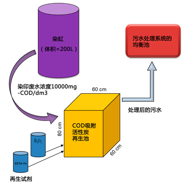 活性炭吸附處理高COD染色廢水,研究中使用5g活性炭從60mL分散的富含染料的廢水中吸附50-60%的COD。所用活性炭的吸附容量約為0.165g-COD/g-活性炭。在使用活性炭進行COD吸附操作期間,無需調整pH或溫度。總體而言,使用活性炭吸附濃縮印染廢水的COD,其次是乙二胺四乙酸鐵鈉催化,飽和活性炭的過氧化物氧化處理可能是去除高COD染色廢水的有前景的替代方案,其氧化劑更少,COD處理效率更高。并且提出了一個按比例放大的200L吸附-再生裝置,并解決了其操作過程和潛在限制。