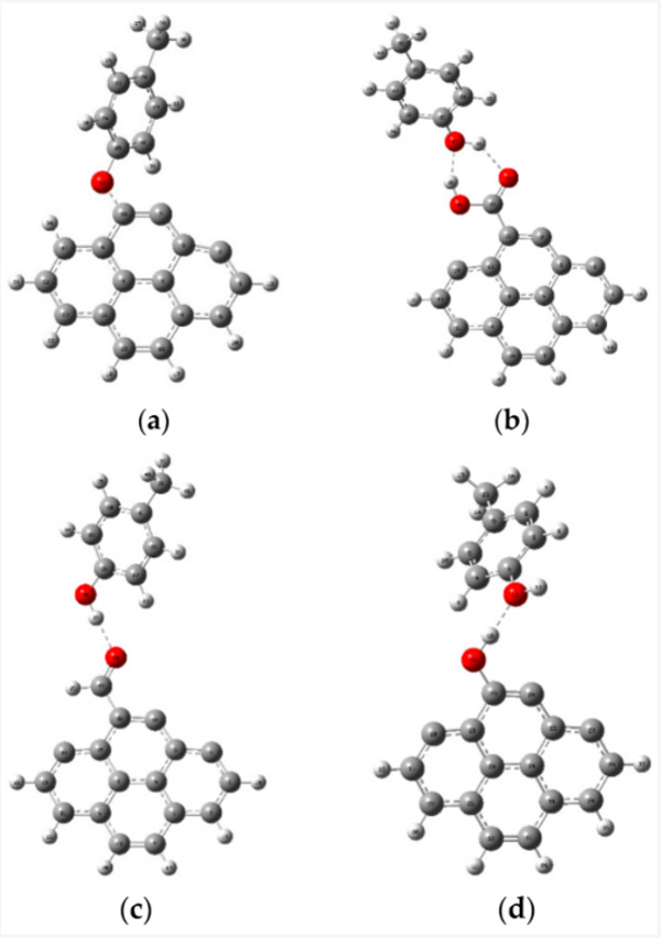 圖1:表示(a)C7H7-OH-C-活性炭,(b)C7H7-HO-HOOC-活性炭,(c)C7H7-OH-OHC-活性炭的優化結構,和(d)C7H7-HO-HO-活性炭相互作用。
