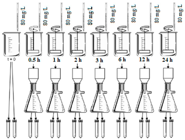 測定平衡時間的吸附試驗對每種活性炭進行兩次。使用了7個裝有500mL研究水的1L燒杯。每個燒杯接受一份活性炭懸浮液,以在水研究中獲得80mg/L的初始濃度。將燒杯放在一個罐子測試設備中,將混合速度保持在205rpm在恒溫23℃的環境中。采用的接觸時間為0.5、1、2、3、6、12和24小時。接觸時間后,將每個燒杯從攪拌中取出,立即通過孔徑為0.22μm的纖維素酯膜過濾研究水,以分離碳并中斷吸附過程。分析過濾后的水餾分的pH值和柱狀藻紅濃度。圖1顯示了平衡時間測定分析中評估的條件的示意圖。
