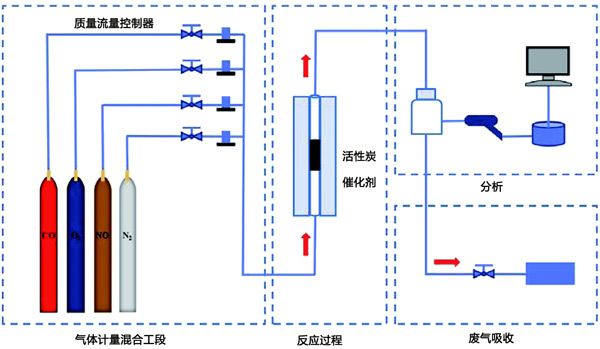 在固定床反應器中進行了載銅活性炭催化劑脫硝和鋅鹽失活實驗。反應裝置如圖1所示。實驗中,將8g催化劑樣品(分別為載銅活性炭、ZnCl2–活性炭和ZnSO4–活性炭)置于反應器中,通過調節爐溫設定反應溫度,將模擬煙氣注入反應器。模擬煙氣由4mL分鐘-1的NO流量、40mL分鐘-1的CO流量、9%的O2體積濃度、500mL分鐘-1的N2總流量組成,氣時空速為3000小時-1。脫硝尾氣采用煙氣分析儀檢測。