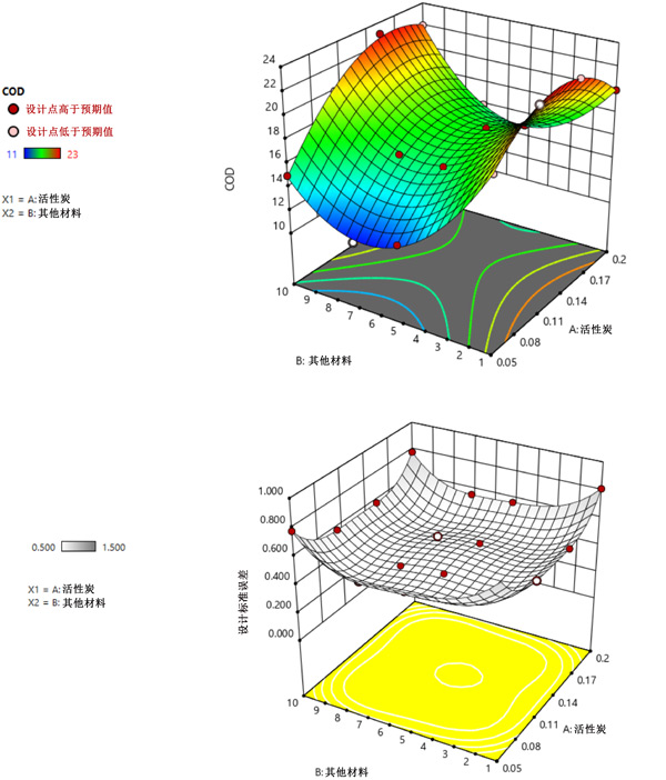 圖1:用于活性炭工藝的有效實驗變化與COD去除的3D圖和標準誤差。