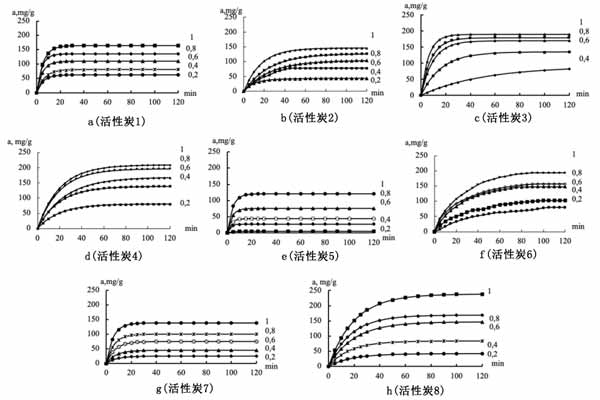 實驗發現即使在成分指標、技術特征和處理來自不同地理形成地點的相同類型廢物形式的原材料的條件下,活性炭吸附劑的產率和個體特性也很接近。根據現有的信息來源,它們并不總是與其最佳樣本相對應。下述實驗數據證實了這種情況。然而,它們具有不同的,并且在某些情況下具有高效率,可用于解決從工業排放物和排放物的有機雜質中凈化的廣泛問題。在植物廢物(a)中獲得的活性炭從其VMA中吸附正丁醇蒸氣的動力學曲線在圖1和圖2中進行了比較。