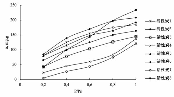 來自植物廢料的活性炭中,活性炭的K值表示吸附劑的吸收能力的最高值,活性炭2的最佳值是由于微孔體積大。表征煤與丁醇相互作用的能量的模型參數n是活性炭的最小參數。這對應于最凸的吸附等溫線(圖2),這有利于捕獲低濃度的丁醇蒸氣。就活性炭3而言,除活性炭4外,所有活性炭均優于活性炭5,與活性炭2相當。根據極限飽和值,由圖1和圖2中的動力學曲線證明。如圖1所示,繪制了相應的吸附等溫線(圖2)。