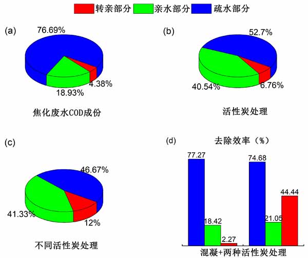 圖1:(a)焦化廢水中溶解有機物組合的比例(b、c)混凝和活性炭處理后溶解有機物組合的比例(d)混凝聯合活性炭處理對溶解有機物組合的去除效率。