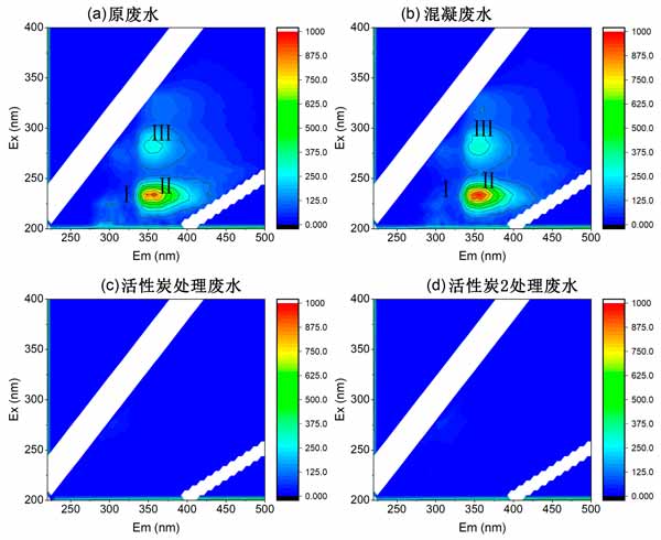 在原廢水和混凝廢水的EEM光譜中檢測到三個主要的熒光峰(I、II、III),如圖2所示。Ex/Em的中心波長約為220/295nm、230/355nm和280/355nm,分別對應于類酪氨酸、類色氨酸和可溶性微生物副產物。在兩種活性炭處理后,流出物中不存在三個主要熒光峰(圖2c、d)。