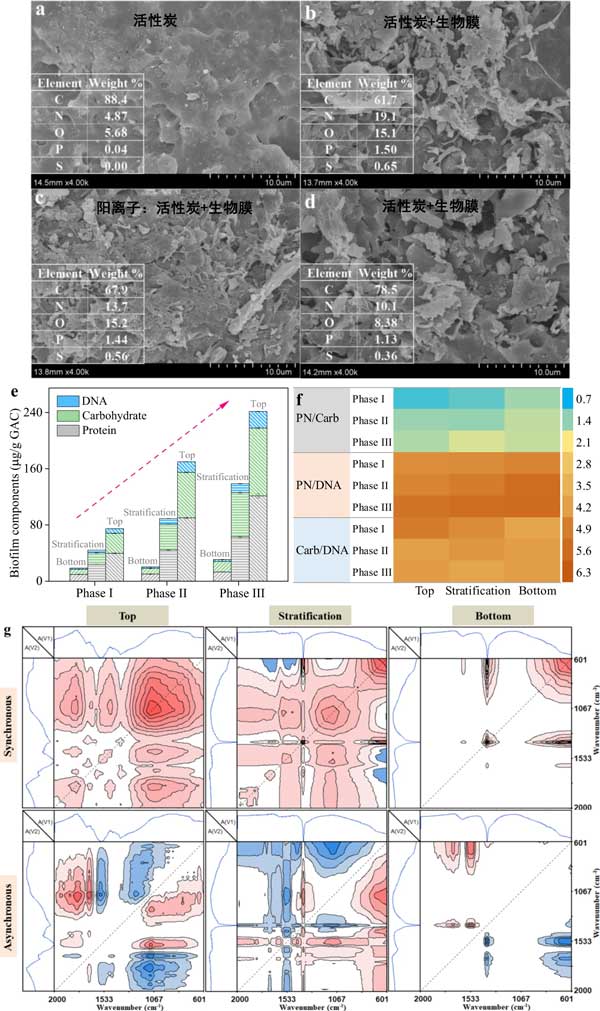 活性炭是生物膜生長的優良載體,它可以快速從液相中吸收有機物和營養物質,用于生物膜中微生物的新陳代謝。圖1顯示了有和沒有生物膜的活性炭形態動力學、生物膜組分的濃度和反應器不同位置的官能團。活性炭中的元素主要包括碳(C,88.4%)、氮(N,4.87%)、氧(O,5.68%),以及少量的磷(P,0.04%),活性炭表面為比較順利。生物膜形成后,活性炭表面附著大量生物質,變得更加粗糙。由于生物膜中蛋白質、碳水化合物和DNA的積累,包括N、O和P在內的主要元素的比例顯著增加(圖1e)。值得注意的是,硫元素也被檢測到,這應該有助于活性炭和生物膜對LAS(磺酸基團)的吸附。
