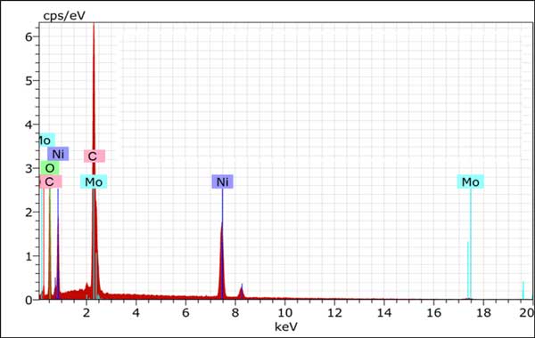 圖1:6%NiMo活性炭催化劑的EDX光譜,分析證實存在約82%的活性炭、5.7%的鎳和14.5%的鉬。