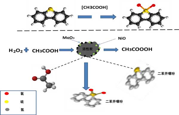 圖3:NiO-MoO3活性炭催化劑存在下H2O2/CH3COOH氧化體系對二苯并噻吩的氧化脫硫機理。