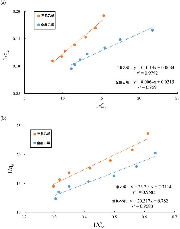 圖2:(a)活性炭和(b)硅膠吸附氯代有機化合物的實驗數據,符合Langmuir等溫線的線性形式。
