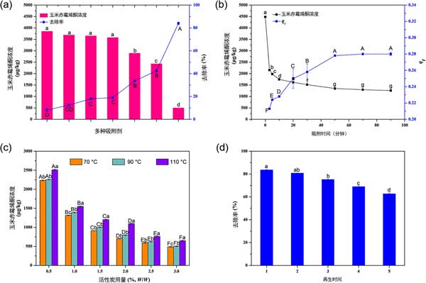 圖1:不同工業吸附劑(a)、吸附時間(b)、活性炭用量和吸附溫度(c)以及活性炭再生穩定性(d)對玉米赤霉烯酮嚴重污染的玉米油中玉米赤霉烯酮去除的影響。