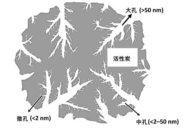 從廣義上講,活性炭是指一種無定形碳質材料,其特征是具有高孔隙率和較大的顆粒間表面積。它被廣泛用作吸附劑。有不同類型的活性炭,例如顆粒狀、粉末狀、浸漬狀、擠壓狀、珠狀等。最常用的類型是粉末狀活性炭。與其他吸附劑類似,表面積、孔隙率、孔體積、吸附容量、化學惰性和穩定性是活性炭更好性能的主要決定特性。以前,大多數有機資源都可以用作生產活性炭的前體。如今,生物質前體由于其低成本、可用性和可再生性而被更頻繁地使用。了解活性炭的多孔特性(包括表面積、孔徑分布和吸附能力)之間的關系對于選擇最合適的吸附劑以有效去除放射性核素至關重要。高度發達的微孔和中孔結構是多孔碳的決定性特征。對于較小分子的吸附,微孔是必需的。活性炭基質中也存在一些直徑小于0.7nm的孔隙。這些孔被稱為超微孔。微孔是最重要的孔,因為它們的表面積很大,由于它們的尺寸較小,因此它們具有更大的吸附能力。這與吸附在微孔中的分子相當。大小介于微孔和大孔之間的分子通常保留在中孔中。大孔是太大而不能被毛細冷凝填充的孔。大孔的主要目的是加快吸附物向位于活性炭內部更深處的小孔的傳輸。然而,大孔也可能容納有機物分解過程中形成的大分子,例如腐殖酸。圖2顯示了活性炭的分級多孔結構。