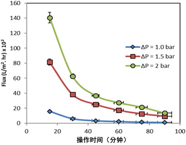 圖3顯示,在運行90分鐘后,在2bar的運行壓差下,達到的最高通量值;谶@些值,已知滲透通量值降低。發生這種情況是由于膜壁上不需要的溶解污染物顆粒堵塞,這些顆粒大于膜孔。這些顆粒堵塞膜表面的孔或卡在孔內。這種膜壁堵塞與濃差極化現象密切相關,在這種現象中,膜壁表面的污染物濃度較高,導致較低的流體流量,而通過膜的污染物最少。也可以在圖3中看到滲透通量隨著較高的操作壓力而增加,這對應于膜操作的驅動力。施加到流過膜的進料流的壓力將導致與膜孔相比顆粒尺寸更小的流體流可以通過膜,而較大的顆粒,例如污染物,將被保留。Fe、Mn、Zn、NH3–N、PO4各污染物從初始濃度1.38、1.30、0.92、0.90、0.93mg/L的總截留率分析結果分別為92.03、97.08、99.67、84.56、87.10%。這些分析結果顯示了這項工作的可喜成果,其中每項總拒絕率都在80%以上。