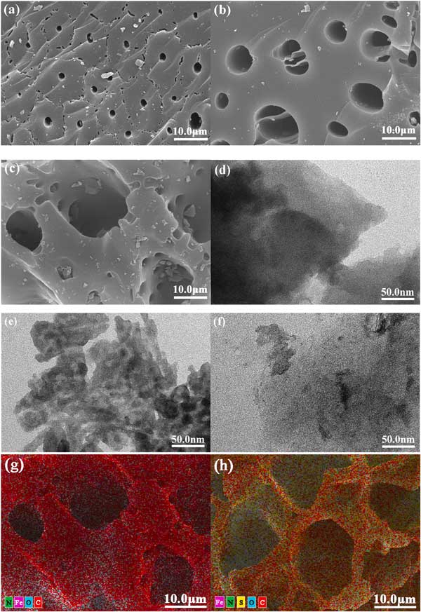 圖1:使用SEM和TEM(a,d)去木質活性炭(b,e)磁性活性炭(c,f)去木質炭圖像;元素(C、O、N、Fe、S)的映射分析:磁性活性炭(g)和磺胺嘧啶吸附的磁性活性炭(h)。