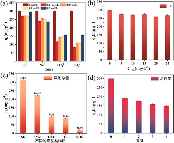 圖2:(a)腐殖酸和(b)共存離子對磁性活性炭吸收磺胺嘧啶的影響,(c)活性炭的吸附選擇性,(d)活性炭吸附磺胺嘧啶的再生性能。