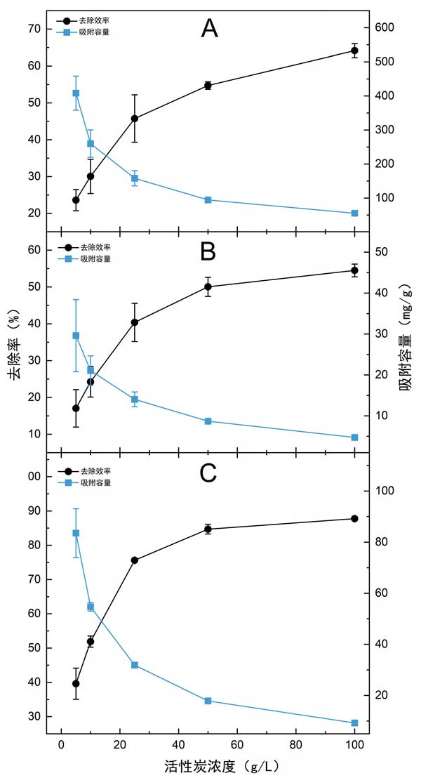 圖1:用幾種濃度的活性炭處理農(nóng)用工業(yè)沼渣時(shí),計(jì)算的COD(A)、PO4-P(B)和總酚(C)參數(shù)的吸附容量和去除效率。