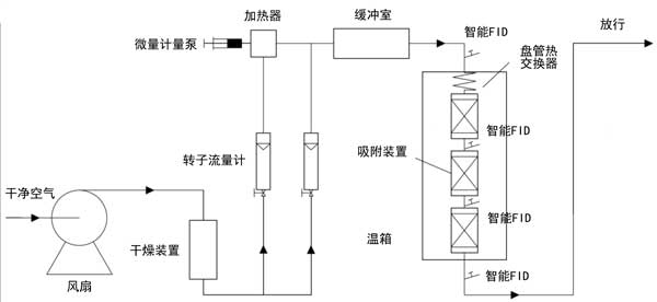 動態吸附技術用于測量甲苯吸附平衡等溫線。圖1描述了實驗裝置。通過該裝置獲得吸附飽和的活性炭。在不同的溫度和濃度下,測量了甲苯的飽和吸附容量。入口溫度和甲苯濃度設定為25–180℃和5–50g/m3。活性炭吸附的甲苯氣體濃度為15g/m3。使用重量分析技術測量吸附等溫線。實驗裝置以實驗室環境空氣為氣源,通過鼓風機將空氣送入裝置。在硅膠干燥裝置中除去水蒸氣后,通過數顯質量流量計的控制,按計算出的比例分成兩路。單向氣流以設定濃度進入氣體發生裝置,即甲苯揮發后的載氣,在氣體緩沖室中與反向流動的稀釋氣體充分混合后進入吸附系統。在吸附系統中,吸附柱緊密均勻地填充CTC100活性炭顆粒,并用鐵架垂直放置在設定實驗溫度的恒溫干燥箱中。混合甲苯氣體首先在恒溫干燥箱內通過氣體預熱管道達到實驗溫度,然后進入裝有活性炭的吸附柱進行吸附實驗。吸附氣體通過檢測口進入檢測系統,智能FID通過連續采樣測量甲苯出口濃度。當氣體發生裝置產生的入口濃度與智能FID檢測的出口濃度一致時,吸附柱中的活性炭達到吸附平衡。吸附氣體通過檢測口進入檢測系統,智能FID通過連續采樣測量甲苯出口濃度。當氣體發生裝置產生的入口濃度與智能FID檢測的出口濃度一致時,吸附柱中的活性炭達到吸附平衡。吸附氣體通過檢測口進入檢測系統,智能FID通過連續采樣測量甲苯出口濃度。當氣體發生裝置產生的入口濃度與智能FID檢測的出口濃度一致時,吸附柱中的活性炭達到吸附平衡。
