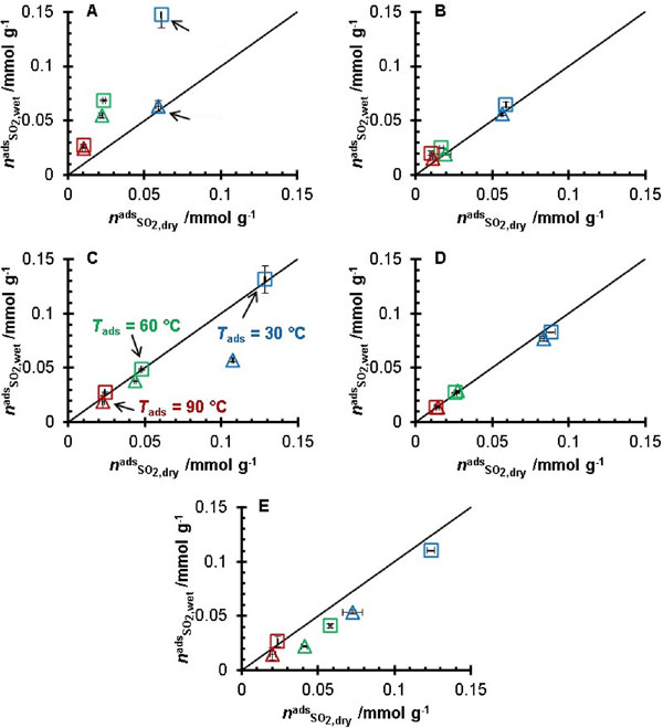 圖1:五種活性炭在濕煙氣與干煙氣混合物中吸附的SO2量。圖中顯示了T=30℃(藍色)、60℃(綠色)和90℃(紅色)實驗結果。